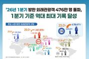 (포탈뉴스통신) 문화체육관광부는 올해 1분기(1~3월) 한국을 방문한 외국인 관광객이 약 476만 명을 기록하며, 3월 중동사태 발생에도 불구하고 1분기 기준 역대 최대 규모를 달성했다고 밝혔다. 이는 2025년 같은 기간 대비 23% 증가한 수치이며, 특히 3월에는 외래객 약 206만 명이 방한해 월별 기준으로도 최대 실적을 경신했다. ‘케이-컬처’의 세계적 인기와 더불어 민관의 적극적인 외래관광객 유치 노력이 결실을 본 것으로 분석된다. 시장별로 보면, 중국 관광객이 145만 명(+29%)을 돌파하며 가장 큰 비중을 차지했고, 일본 관광객도 94만 명(+20.2%)이 한국을 찾으며 성장세를 이어갔다. 대만 관광객은 54만 명(+37.7%)까지 증가하여 주요 시장 중 증가세가 가장 두드러졌다. 그 외 미국, 유럽 등 원거리 시장 외래객도 69만 명(+17.1%)으로 증가하며 방한 시장 다변화를 이끌었다. 올해 1분기에는 크루즈 관광 시장의 성장도 돋보였다. 제주·부산·인천 등 주요 기항지로 입항한 크루즈선은 총 338척(항차 기준)으로 전년 같은 기간 대비 52.9% 증가했다. 이는 정부가 추진해 온 기항지 관광 콘텐츠