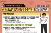 (포탈뉴스통신) 충북 진천군은 전국적으로 전년도보다 빠르게 인플루엔자 유행이 시작됨에 따라 호흡기 감염병 예방수칙 준수를 당부했다. 질병관리청은 2025년 10월 17일 0시를 기해 인플루엔자 유행 시작을 알리고 감염 주의를 당부하기 위해 인플루엔자 유행주의보를 발령했으며, 연령별로는 7~12세, 1~6세 순으로 발생하고 있다. 인플루엔자 감염을 예방하기 위해서는 호흡기 예방수칙 준수와 예방접종이 필수이다. 예방수칙으로는 △기침할 때는 휴지, 옷소매로 입과 코 가리기 △호흡기 증상 있을 시 마스크 착용하기 △흐르는 물에 비누로 30초 이상 손 씻기 △씻지 않은 손으로 눈, 코, 입 만지지 않기 등이 있다. 만약 발열과 호흡기 증상이 발생하면 출근이나 등교를 자제하고, 고위험군(65세 이상, 영유아, 면역저하자)과 고위험군과 자주 접촉하는 환경에 있는 사람은 증상이 있을 시 의료기관을 신속하게 방문하는 것이 중요하다. 송보경 군 보건행정과 주무관은 “인플루엔자의 유행 시기가 빨라지고 유행 기간도 길어질 것으로 예상되므로, 군민들께 호흡기 예방수칙 준수를 당부드린다”며 “특히, 인플루엔자