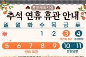 (포탈뉴스통신) 여수시도시관리공단은 대명절 추석 연휴 기간(10월 5일~10월 9일) 동안 공단이 운영 중인 공공 체육시설을 휴관한다고 밝혔다. 휴관 대상은 △진남수영장 △망마국민체육센터 △장애인국민체육센터이며, 정상 운영은 10월 10일(금)부터 재개된다. 다만, 연휴 전 개천절인 10월 3일(금)에는 망마국민체육센터 다목적체육관만 운영하며, 10월 4일(토)에는 진남수영장과 망마국민체육센터가 정상 운영된다. 공단은 추석 연휴 기간에도 시설물 안전관리와 긴급상황 대응을 위해 비상근무 체계를 가동해 시민과 관광객들이 안심할 수 있도록 최선을 다한다는 방침이다. 여수시도시관리공단 이사장은 “민족 최대 명절인 추석을 맞아 가족과 함께 안전하고 따뜻한 시간을 보내시길 바란다”며, “연휴 동안에도 공단은 시민의 안전을 최우선으로 하고, 휴관 이후 더욱 쾌적한 환경에서 체육시설을 이용할 수 있도록 최선을 다하겠다”고 말했다. 시설별 세부 운영 일정은 여수시도시관리공단 공공 체육시설 전용 홈페이지에서 확인할 수 있다. [뉴스출처 : 전라남도 여수시도시관리공단]