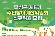 (포탈뉴스통신) 달성군은 11월 14일부터 28일까지 제5기 주민참여예산위원회 신규위원 11명을 모집한다. 달성군 주민참여예산위원회는 제안사업의 적정성을 검토하고 심의대상을 결정하며, 사업 담당부서와 논의·조정, 사업 대상지 현장 확인 및 추진결과 평가 등 주민참여예산의 전 과정에 참여한다. 모집인원은 일반위원 10명, 청년위원 1명으로 총 11명이며, 임기는 2년으로 1회 연임이 가능하다. 제출서류 등 자세한 내용은 달성군 누리집을 참고하여 방문, 우편, 이메일로 신청하면 된다. 일반위원은 달성군에 주소를 두거나 직장소재지가 달성군인 사람은 누구나 지원할 수 있다. 청년위원은 공고일 기준 19세 이상 34세 이하로, 달성군에 주소를 두고 있거나 군 소재 대학의 재학생이면 지원 가능하다. 최재훈 달성군수는 “생활 속 불편을 가장 잘 아는 주민이 예산 과정의 주체로 참여할 때 정책의 실효성이 커진다”며 “관심 있는 여러분의 적극적인 지원을 부탁드린다”고 말했다. [뉴스출처 : 대구시 달성군]