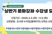 (포탈뉴스통신) 창원특례시 의창도서관과(과장 김외화)는 다양한 문화강좌를 통해 시민의 평생교육을 지원하고 문화생활의 기회를 제공하기 위해 ‘2026년 의창도서관과 상반기 문화강좌’ 수강생을 모집한다. 최윤덕도서관, 고향의봄도서관, 명곡도서관 3개 도서관에서 진행되는 이번 문화강좌는 ▲최윤덕도서관의 ‘독서 하브루타’를 포함한 성인 5개, 어린이 9개 강좌 ▲고향의봄도서관의 ‘팝과 함께하는 생활 영어’를 포함한 성인 3개, 어린이 5개 강좌 ▲명곡도서관의 ‘감성 어반 스케치’를 포함한 성인 2개, 어린이 6개 강좌를 운영한다. 상반기 수강생 모집은 3월 3일 오전 10시부터 최윤덕·고향의봄·명곡도서관 누리집에서 선착순 접수 예정이다. 의창도서관과 김외화 과장은 “도서관이 단순한 독서 공간을 넘어, 다양한 문화강좌로 시민들이 풍요로운 문화생활을 누릴 수 있는 독서문화 환경을 제공하겠다”며 시민들의 많은 관심과 참여를 당부했다. 자세한 내용은 최윤덕도서관, 명곡도서관, 고향의봄도서관 누리집과 의창도서관과 블로그를 참고하면 된다. [뉴스출처 : 경상남도창원시]