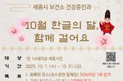 (포탈뉴스통신) 세종특별자치시 보건소가 1일부터 31일까지 한글날을 맞아 ‘10월 한글의 달 함께 걸어요’ 걷기 도전 행사를 운영한다. 이번 행사는 오는 9∼11일 개최하는 세종한글축제와 한글날을 기념하고, 시민들의 건강을 증진하기 위해 마련됐다. 걷기 도전 행사에 참여하려면 세종호수공원 둘레길 50% 이상을 1회 이상 걷고, 10월 중 총 10만 보를 달성하면 된다. 시 보건소는 조건을 충족한 참여자 중 300명을 추첨, 지역화폐 여민전 3,000원을 지급한다. 참여 방법은 본인 명의 휴대전화에 ‘워크온’ 앱을 설치한 뒤 ‘세종시공식커뮤니티’에 가입하고, ‘10월 한글의 달 함께 걸어요’ 걷기 도전을 신청하면 된다. 김수영 보건소장은 “시민들이 걷기 도전을 통해 건강한 생활습관을 실천하고, 한글날과 축제의 의미도 되새기는 계기가 되길 바란다”고 말했다. [뉴스출처 : 세종시]