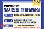 (포탈뉴스통신) 서울 강동구는 오는 12월 13일, 수험생들의 효율적인 정시 지원 전략 수립을 돕기 위한 ‘2026학년도 정시전형 대입상담실’을 운영한다고 13일 밝혔다. 이번 대입상담실은 정시 지원을 앞둔 수험생과 학부모를 대상으로, 2026학년도 대입 정시전형 관련 궁금증을 해소하고 개인별 맞춤형 대학·전공 지원 전략 수립을 지원하기 위해 마련됐다. 상담은 수능성적 통지 직후 주말인 12월 13일에 강동구 미래교육혁신센터에서 진행되며, 총 18개 상담 부스를 운영해 회당 40분간 심층 상담이 이뤄질 예정이다. 이를 통해 수험생과 학부모가 안정적으로 정시전형을 준비할 수 있도록 지원한다. 상담은 한국대학교육협의회 대입상담교사단 소속 교사들이 맡아 전문 대입 상담 프로그램을 활용, 정확하고 체계적인 상담 서비스를 제공한다. 참여 신청은 오는 11월 18일부터 통합교육포털 ‘강동 미래온’ 누리집(홈페이지)을 통해 온라인으로 할 수 있으며, 선착순으로 접수받는다. 이수희 강동구청장은 “시기별‧개인별 맞춤 상담을 통해 수험생과 학부모님들이 체계적으로 정시 지원 전략을 세울 수 있기를 기대한다