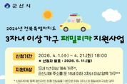 (포탈뉴스통신) 군산시는 다자녀 가구의 경제적 부담을 완화하고 이동 편의를 제공하여 저출생 위기를 극복하고자 ‘2026년 전북특별자치도 3자녀 이상 가구 패밀리카 지원사업’ 참여자를 모집한다고 밝혔다. 이번 사업은 전북자치도 내에 1년 이상 계속 거주하면서 군산시에 주소를 둔 18세 이하의 자녀 3명 이상을 양육하는 가구를 대상으로 하며, 공고일 기준 자녀 중 3명 이상이 2007년 4월 1일 이후 출생한 경우에 신청할 수 있다. 지원 대상으로 선정된 총 30가구에게는 6~11인승 패밀리카 신차 구입비의 10%, 가구당 최대 500만 원까지 지원금이 지급된다. 지원 가능한 차량은 2026년 1월 1일 이후 계약하고 공고일 이후 신규로 등록된 국산 승용 또는 승합자동차에 한하며, 전기자동차를 구매할 경우에는 기존의 전기차 보조금을 제외한 실제 차량 구입비를 기준으로 지원금이 산정된다. 다만 공고일 기준 가족 구성원이 7년 이내의 패밀리카를 이미 보유하고 있거나, 지방세를 체납 중인 경우 등은 지원 대상에서 제외된다. 또한 5인승 차량을 2대 이상 보유했거나 7년이 경과한 패밀리카를 보유한