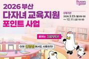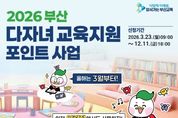 (포탈뉴스통신) 부산시는 부산시교육청과 함께 학령기 자녀를 둔 다자녀 가정을 지원하기 위한 '부산 다자녀 교육지원포인트' 사업을 추진한다고 밝혔다. 다자녀 가정의 교육비 지출 부담 완화를 위해 시와 시교육청이 7대 3으로 재원을 분담해 운영하는 사업으로 2024년 시작해 올해로 3년째 추진된다. 지난해 12만 2천여 다자녀 가정에 총 414억 원을 지원했으며, 공공마이데이터 연계를 통해 신청·심사 절차를 간소화한 결과 절차 만족도가 2024년도 76.1%에서 91.6%로 크게 개선되는 등 이용 편의성과 정책 체감도가 높아진 것으로 나타났다. '부산 다자녀 교육지원포인트'는 소득·재산 기준과 관계없이 자녀 1명 이상이 2008∼2019년생(초·중·고 학령)에 해당하는 부산시 다자녀가정이면 누구나 지원받을 수 있다. 지원 규모는 2자녀 가정에 30만 원, 3자녀 이상 가정에 50만 원의 교육지원포인트가 지급된다. 다만, 부산 시민 혜택 제공을 위해 신청인 주민등록 기준 최소 3개월 이상 부산시에 거주해야 한다, 교육지원포인트는 부산 지역화폐 동백전의 정책지원금으로 지급되며,