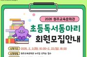 (포탈뉴스통신) 원주교육문화관(관장 용석태)은 2월 3일부터 선정 도서를 깊이 읽는 활동을 통해 문해력을 강화하고 지역사회 독서 공동체를 활성화하기 위해 초등학생과 중학생을 대상으로 ‘2026년 독서동아리 회원 모집’을 실시한다. 동아리 수업은 3월부터 매주 토요일 오후 1시부터 5시까지 총 24회 운영되며, 전문 강사와 함께 선정 도서를 바탕으로 한 독후활동 및 토론 수업으로 진행된다. 주요 동아리는 △1학년 대상 ‘책씨앗’ △2학년 대상 ‘책잎새’ △3학년 대상 ‘책줄기’ △4학년 대상 ‘책꽃’ △5·6학년 대상 ‘책열매’ △중학생 독서동아리로 구성된다. 동아리별 모집 인원은 초등학생과 중학생 각 15명이며, 신청 기간은 초등독서동아리는 2월 22일, 중학생 독서동아리는 2월 20일까지다. 자세한 사항은 원주교육문화관 누리집에서 확인할 수 있으며, 기타 문의는 원주교육문화관 종합자료실·어린이자료실로 하면 된다. [뉴스출처 : 원주교육문화관]
