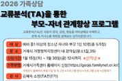 (포탈뉴스통신) 거제시가족센터는 오는 2일부터 진행하는'교류분석(TA)을 통한 부모–자녀 집단상담 프로그램' 참여자를 모집한다고 밝혔다. 프로그램 주요 내용은 자아상태검사, 부모-자녀 간 의사소통 패턴 이해하기, 갈등 상황에서 안정적인 대화법 등으로 청소년의 마음 성장과 가족관계 회복을 지원하는 데 목적이 있다. 모집 대상은 예비 중학생 이상의 청소년 자녀와 양육자 5가정이며, 거제시가족센터 홈페이지를 통해 신청‧접수 가능하다. 자세한 문의는 거제시가족센터로 하면 된다. 류주진 센터장은 “방학은 가족이 서로를 이해하고 관계를 돌아볼 수 있는 좋은 시기”라며 “부모와 아이가 한 걸음 더 가까워지는 시간이 되길 바란다”고 밝혔다. [뉴스출처 : 경상남도 거제시]