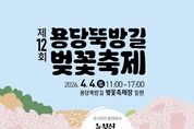 (포탈뉴스통신) 순천시 삼산동행정복지센터는 4월 4일 동천 벚꽃길 일대(용당동 705)에서 ‘국가하천 동천에서 눈부신 행복의 순간 함께해요, 우리’라는 주제로 제12회 용당뚝방길 벚꽃축제를 개최한다고 밝혔다. 이번 축제는 오전 11시부터 오후 5시까지 진행된다. K-pop 댄스, 저글링, 태권도 군무 등 다채로운 공연부터 달고나, 페이스페인팅, 풍선아트, 헤어핀 만들기, 쿠키 아이싱, 벚꽃 사진관 부스 등 남녀노소 누구나 함께 어울려 즐길 수 있는 다양한 체험 프로그램이 준비돼 있다. 삼산동 직능단체에서 운영하는 음식 부스에서는 정성 가득한 음식도 맛볼 수 있다. 특히, 지난 축제와 달리 올해는 아이들이 마음껏 뛰어놀 수 있는 에어바운스가 설치되고, 삼산동 대표 캐릭터인 ‘꾸비’ 대형 공기 조형물 2개가 행사장에 배치돼 방문객들을 더욱 친근하게 맞이할 예정이다. 관내 유관기관도 함께 힘을 보탠다. 순천경찰서에서는 실종아동 예방을 위해 사전지문 미등록 아동을 대상으로 한 현장 등록 부스를 운영할 계획이며, 순천시 보건소에서도 만 60세 이상을 대상으로 치매 예방을 위한 치매 조기검진을