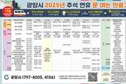 (포탈뉴스통신) 광양시는 추석 연휴 시민과 귀성객의 의료기관‧약국 이용 불편을 최소화하기 위해 10월 3일부터 10월 9일까지 7일간 소아․임산부와 응급환자에 대한 비상진료대책을 마련했다고 밝혔다. 이번 연휴 기간 ▲지역응급의료기관 2개소 ▲병의원 70개소 ▲보건기관 8개소 ▲휴일지킴이 약국 39개소가 운영된다. 지역응급의료기관인 ▲광양사랑병원 ▲광양서울병원은 응급실을 24시간 비상 체제로 운영한다. 또 소아‧청소년과 임산부 진료를 위해 ▲다나소아과의원 ▲미래여성의원 ▲선린의원 ▲모든아이소아청소년과 ▲큰사랑소아청소년과 5개소가 운영된다. 시는 비상진료대책을 차질 없이 운영하기 위해 보건소 내 ‘비상진료대책 상황실’을 설치하고, 의료기관 상황을 지속적으로 모니터링할 계획이다. 긴급상황 발생 시에는 소방서 119(구급상황센터)와 권역별 응급의료센터에 지원을 요청해 신속하고 안전한 진료가 이뤄질 수 있도록 할 방침이다. 시는 “연휴 기간 의료기관과 약국 이용 시, 운영시간을 미리 확인해 달라”고 당부했다. 추석 연휴 문 여는 의료기관과 약국 현황은 ▲광양시 모바일 앱