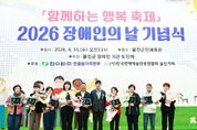 (포탈뉴스통신) 울진군은 장애인복지시설(2개소) 및 단체(7개소) 주관으로 지난 4월 15일‘2026년 장애인의 날 기념식’을 개최했다. 이번 행사는 “당연한 일상, 모두가 누릴 수 있도록”이라는 주제로 장애인과 비장애인이 함께 어우러지는 통합의 장으로 마련됐으며, 장애인 기관·단체 관계자와 장애인 및 가족, 자원봉사자 등 800여 명이 참석했다. 기념식은 1부와 2부로 나뉘어 진행됐다. 1부에서는 고고장구 축하공연을 시작으로 장애인복지 증진에 기여한 유공자 표창 수여, 기념사 및 격려사 등이 이어지며 화합의 시간을 가졌다. 2부에서는 마술공연과 연예인협회(울진군지부)의 재능기부 공연이 펼쳐져 참석자들에게 즐거움을 선사했다. 울진군 관계자는“장애인들이 차별 없이 살아갈 수 있는 사회, 누구나 존중받고 가능성을 펼칠 수 있는 울진을 만들기 위해 노력하고 있다”며“앞으로도 비장애인들이 누리는 당연한 일상이 장애인에게 더 이상 바람이 아닌 현실이 되는 그날까지 최선을 다하겠다”라고 말했다. 한편 장애인의 날은 장애인에 대한 이해를 높이고 재활의욕을 고취하기 위해 제정된 법정기