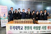 (포탈뉴스통신) 완주군이 24일 우석대학교 교양관에서 2026년 ‘천 원의 아침밥’ 사업의 시작을 알리는 행사를 열고 올해 본격적인 사업 추진에 나섰다. 이날 행사에는 유희태 완주군수와 박노준 우석대학교 총장, 이순덕 군의원, 김정은 사회적협동조합 양지뜰 대표 등이 참여해 바쁜 학업으로 아침 식사를 거르는 대학생들에게 로컬푸드 식재료로 만든 식사를 직접 배식하며 따뜻한 격려를 건넸다. 군은 학생들의 높은 호응을 반영해 올해 운영 규모를 작년보다 대폭 키웠다. 지난해 기준 43일이었던 일수를 올해 80일로 2배 가까이 확대해 운영한다. 이를 통해 더 많은 학생이 학기 중 꾸준히 양질의 아침 식사를 제공받을 수 있게 됐다. 제공하는 메뉴 역시 학생들의 목소리를 적극적으로 반영했다. 지역산 쌀을 활용한 다양한 덮밥류와 완주로컬푸드협동조합(이사장 권승환)과 재단법인 완주공공급식지원센터를 통해 공급받은 신선한 제철 과일 등 영양가 높은 간편식 식단으로 구성해 운영할 예정이다. 유희태 완주군수는 “천 원의 아침밥 사업은 청년들이 건강하게 미래를 준비하도록 돕는 핵심적인 복