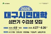 (포탈뉴스통신) 대구광역시는 시민의 평생학습 기회를 확대하고 변화하는 학습 수요를 반영해 4월 8일부터 ‘2026년 상반기 대구시민대학’ 수강생을 모집한다. 이번 상반기 시민대학은 4월 27일부터 6월 26일까지 약 2개월간 운영되며, 시민이 직접 제안한 21개 강의와 5개 기획 강의 등 총 26개 강좌로 구성됐다. 강좌는 인공지능(AI)·디지털, 인문교양, 문화예술, 직업능력, 실용교육 등 시민의 일상과 밀접한 다양한 분야를 아우르며, 참여형·체험형 교육을 강화해 실질적인 학습 효과를 높였다. 주요 강좌로는 ▲AI와 함께하는 나만의 인생 영상 ▲신중년 경력 설계 수립의 다양한 사례 이해 ▲백세시대의 자연치유 건강법 ▲색연필 보타니컬아트 ▲생활 속 아로마테라피 DIY 클래스 등이 있다. 특히 올해는 강좌별 운영 횟수를 기존 3회에서 5회로 확대해 학습의 연속성을 높이고, AI 대전환 흐름에 맞춰 관련 강좌를 기초·심화 단계로 세분화해 수준별 맞춤 교육이 가능하도록 설계했다. 또한 교육 장소를 대구평생교육진흥원 대구지식발전소(북구 연암로 40, 산격청사)뿐 아니라 외부 교육장(중구 태