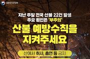 (포탈뉴스통신) 지난 주말 전국 산불 22건 발생 주요 원인은 '부주의' 산불 예방수칙을 지켜주세요 · 산에서 취사, 흡연 등 금지 · 산 근처에서 쓰레기 소각 금지 · 연기, 불씨 보면 119 신고 "불법소각, 꽁초 투기 등 위반 행위 엄정 대응" [뉴스출처 : 문화체육관광부]
