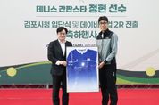 (포탈뉴스통신) 김포시는 17일 솔터실내테니스장에서 대한민국 테니스 스타 정현 선수의 김포시청 직장운동경기부 테니스팀 입단을 기념하고, 데이비스컵 2라운드 진출을 축하하는 행사를 개최했다. 이날 행사에는 김병수 김포시장을 비롯해 임청수 김포시체육회장, 박헌규 김포시테니스협회장과 테니스 관계자 및 동호인 등이 참석해 자리를 빛냈다. 행사는 시민과 동호인을 대상으로 한 팬 사인회를 시작으로 정현 선수의 주요 활약상을 담은 영상 상영, 기념 퍼포먼스, 입단 소감 및 축사 순으로 진행됐다. 특히 이날 행사에서는 정현 선수가 최근 데이비스컵 경기에서 실제 착용한 유니폼을 기념 액자로 제작해 김병수 시장에게 전달하는 의미 있는 시간이 마련됐다. 해당 유니폼은 국가대표 경기 특성상 소속팀 마크를 부착할 수 없음에도 불구하고, 정현 선수가 김포시청 입단을 기념하고 김포시를 알리기 위해 대한테니스협회에 요청해 특별히 김포시청 마크를 부착하고 출전한 것으로 알려져 의미를 더했다. 이어 김병수 시장은 정현 선수에게 꽃다발을 전달하고, 정현 선수의 유니폼에 김포시청 마크를 부착하는 퍼포먼스를 통해 김포시청 선수로서의 새