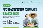 (포탈뉴스통신) 전남 강진군이 지난 5일부터 오는 2월 11일까지 ‘2026년 후계농업경영인 육성사업’ 신청자를 모집한다. ‘후계농업경영인 육성사업’은 농업 발전을 이끌 예비 농업인과 성장 가능성이 높은 농업경영인을 발굴해 자금 지원과 함께 교육, 컨설팅 등을 종합적으로 제공함으로써 안정적인 농업 경영체로 성장할 수 있도록 지원하는 사업이다. 신청 대상은 신청 연도 기준 18세 이상 50세 미만(1976년 1월 1일~2008년 12월 31일)으로, 영농 종사 경력이 없거나 10년 미만인 농업인이다. 지원조건으로는 대학의 농업 관련 학과 또는 농업계 고등학교를 졸업했거나, 시장·군수·구청장이 인정한 농업 교육기관에서 관련 교육을 이수한 자, 병역 미필자의 경우 2026년도 산업기능요원 편입 대상자이거나 군 복무를 마친 자 등이다. 특히, 이번 2026년도 사업 신청은 농림사업정보시스템(Agrix) 고도화에 따라 구축된 ‘농업e지’ 홈페이지를 통해 온라인으로만 접수가 진행된다. 신청 희망자는 해당 홈페이지에 신청서와 구비서류를 기한 내 제출해야 하며, 현장 방문 접수는 받지 않는다. &nb