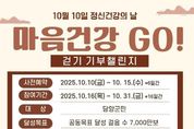 (포탈뉴스통신) 산청군은 10일부터 24일까지 ‘정신건강 홍보주간’을 운영한다고 밝혔다. 이번 운영은 정신건강의 날(10월 10일)을 맞아 정신건강의 중요성 환기와 정신질환에 대한 편견을 해소하기 위해 마련됐다. 정신건강복지센터에서 실시하는 운영에서는 나의 마음건강 관리법 공유하기와 정신건강 인식개선을 위한 룰렛 OX 퀴즈, 힐링차 체험 등이 진행된다. 또 정신건강 인식개선 브랜드 ‘마주해요’를 중심으로 옥외광고, 정신건강의 날 기념 포스터 게시, 온라인 이벤트도 추진한다. 뿐만 아니라 지역 내 5곳 전통시장에서 피켓을 활용한 길거리 캠페인을 비롯해 찾아가는 심리지원 서비스 마음안심버스 운영, 정신건강복지센터 등록 대상자와 함께하는 영화 관람, 아동·청소년 대상 참여형 캠페인 등이 이뤄진다. 산청군은 이번 운영이 다양한 연령층의 참여를 통해 정신건강에 대한 관심이 높아지고 인식개선에 기여할 것으로 기대하고 있다. 김솔 산청군보건의료원장(정신건강복지센터장)은 “이번 주간 운영을 통한 다양한 행사와 캠페인이 정신건강에 대해 서로 마주 볼 수 있는 계기가 되길 바란다”고 말했