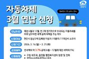(포탈뉴스통신) 천안시 동남구는 내달 16~ 31일 자동차세 연납 신청을 받는다고 27일 밝혔다. 매월 6월과 12월 정기적으로 부과되는 자동차세를 미리 납부하면 세금 할인 혜택을 받을 수 있다. 3월에 연납 신청할 경우 4~ 12월에 대한 세액의 5%(연세액의 약 3.7%)를 공제받을 수 있다. 신청 대상자는 천안시 동남구에 등록된 모든 차량 소유자로, 기간 내에 신청해야 할인 혜택을 받을 수 있다. 신청은 구청 세무과·읍면동 행정복지센터 방문, 전화, 위택스를 통해서 가능하다. 납부는 전국 모든 은행 CD/ATM, 위택스·인터넷지로, 가상계좌 이체 중 편리한 방법으로 하면 된다. 한익희 세무과장은 “지난달 연납 신청 기회를 놓친 시민분들께서는 3월 신청 기간을 적극 활용해 세금 절감 혜택을 누리시길 바란다”고 말했다. [뉴스출처 : 충청남도 천안시]