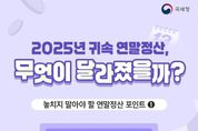 (포탈뉴스통신) ■ 2025년 연말정산 혜택 종합안내 · 국세청이 2025년 귀속 연말정산부터 새롭게 적용되는 공제·감면 사항에 대해 미리 알려드립니다! - 2025년 귀속 연말정산 일정 *카드 이미지 참조 - 홈택스 「간소화서비스」 개통 2026.1.15.(목) · 교육비 등 공제·감면에 필요한 소득·세액공제 자료 45종을 손쉽게 확인 가능 · 발달재활 서비스 이용증명서, 수영장·체력단련장 신용카드 등 사용(7.1. 이후)이용료 최초 제공 ■ 자녀·가족 공제, 이렇게 바뀌었습니다! · 자녀세액공제 상향 - 8세 이상 20세 이하 기본공제 대상 자녀 수에 따른 자녀세액공제 금액 10만 원 상향 *자녀 1명(25만 원), 2명(55만 원), 3명(95만 원), 4명(135만 원) 등 · 발달재활아동 장애 증빙 인정범위 확대 - 발달재활서비스 이용증명서 만으로 장애인 추가공제(200만 원) 가능 *발달재활서비스를 지원받는 아동이 9세 미만 · 중소기업 취업자 감면 합리화 - '25.3.14. 이후 중소기업 재취직한 남성 근로자도 취업일로부터 3년간 소득세의 70% 감면 → 서