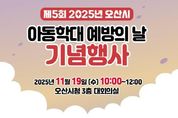 (포탈뉴스통신) 오산시는 오는 19일 ‘아동학대예방의 날’과 ‘아동학대예방주간’을 맞아 기념행사 및 온·오프라인 캠페인을 실시한다고 12일 밝혔다. 행사는 19일 오전 10시부터 12시까지 오산시청 대회의실에서 진행되며, ▲1부 아동학대예방의 날 기념식 식전공연, 유공자 표창 시상, 퍼포먼스, ▲2부 부모교육 특별강연으로 구성된다. 특별강연은 리플러스 인간연구소 박재연 소장이 ‘부모를 위한 건강한 대화방법’을 주제로 진행한다. 매년 11월 19일은 아동학대 예방과 방지에 대한 사회적 관심을 높이기 위해 제정된 법정기념일로, 오산시는 매년 기념식과 강연, 캠페인 등을 통해 아동학대 예방의 중요성을 알리는 다양한 활동을 추진해오고 있다. 시는 이달 25일까지 온라인 릴레이 캠페인도 함께 진행한다. 오산시민 누구나 SNS에 아동학대예방 메시지 또는 관련 사진을 업로드해 참여할 수 있다. 또한 11월 24일에는 시청 인근 주요 교차로에서 시민 대상 오프라인 홍보 캠페인을 실시해 아동학대 예방 인식 제고에 나설 예정이다. 박현주 아동복지과장은 “이번 행사가 아동학대 예방의 중요성을 되새기고 아이들에게 더 따