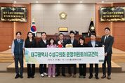 (포탈뉴스통신) 대구 수성구의회 운영위원회 소속 의원들이 울산 중구의회를 찾아 교류행사를 가졌다. 울산 중구의회 의회운영위원회 29일 의원회의실에서 대구 수성구의회 운영위원회와 방문 간담회를 마련했다. 이날 간담회에는 중구의회 의회운영위원회 소속 안영호 위원장을 비롯해 문기호 부위원장, 강혜순·김도운·정재환 의원 등이 참석한 가운데 대구 수성구의회 운영위원회 의원들과 환담을 갖고 두 도시 간 특징과 의회운영방안, 향후 교류 방향성 등을 논의했다. 대구 수성구의회는 지난 2019년에 복지건설위원회가, 2017년에는 도시보건위원회 소속 의원들이 울산 중구의회를 찾는 등 이번이 세 번째 방문이다. 특히 수성구의회는 전국적인 모범사례로 손꼽히고 있는 중구의회의 공무국외연수 운영 방안에 대해 큰 관심을 보이며 전반적인 운영 상황을 주의 깊게 청취하기도 했다. 수성구의회 황치모 위원장은 “울산 중구는 제2호 국가정원을 품은 역사와 전통, 문화가 살아있는 곳이라 꼭 한번 방문해 보고 싶었다”며 “중구의회의 환대에 감사드리며 의원 운영 전반에 발전방안을 잘 보고 배워가는 소중한 기회로 삼겠다”고 말했