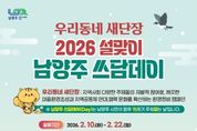 (포탈뉴스통신) 남양주시는 10일부터 22일까지 시 전역에서 ‘설맞이 우리동네 새단장 남양주 쓰담데이 집중 추진기간’을 운영한다고 밝혔다. 이번 집중 추진은 설 명절을 앞두고 생활권 주변 환경을 정비하고 시민이 일상 속에서 실천하는 환경정화 활동을 확산하기 위해 마련됐다. ‘남양주 쓰담데이’는 시가 운영하는 대표적인 시민참여형 환경정화 프로그램이다. 특히 이번 쓰담데이는 행정안전부가 추진하는 전국 단위 환경정화 캠페인 ‘우리동네 새단장’과 연계해 추진한다. 지역별·단체별 자율 참여를 통해 공동체 중심의 환경 개선 활동을 확산하는 데 의미를 둔다. 2026년 현재 쓰담데이에는 약 5,200명과 277개 단체가 참여한다. △환경보호단체 △지역사회단체 △우리아파트봉사단 △상인회 등 다양한 주체가 정기적인 활동을 이어가고 있다. 시는 이번 집중 추진기간을 통해 명절 전 도시 환경을 정비하고, 시민 주도의 환경보전 실천 분위기를 확산시킬 방침이다. 이후에도 시민 중심의 자율적인 마을 단위 쓰담데이를 위한 행정적 지원을 지속할 계획이다. 쓰담데이 참여를 희망하는 시민은 남양주시 자원봉사센터 또는