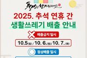 (포탈뉴스통신) 태백시는 추석 연휴 기간 원활한 생활폐기물 수거와 쾌적한 도시 환경 유지를 위해 연휴 전인 10월 3일·4일, 연휴 후인 8일·9일에 생활폐기물을 정상 수거한다고 밝혔다. 연휴 동안에는 배출일을 반드시 준수해야 하며, 특히 단독주택 지역은 장기간 방치로 인한 악취와 환경오염이 발생하지 않도록 각별한 주의가 요구된다. 또한, 시는 10월 3일부터 9일까지 ‘생활폐기물 대책상황반’과 기동처리반(생활환경팀 )을 운영해 불법 투기 및 관련 민원에 신속히 대응할 방침이다. 태백시 관계자는 “시민 여러분의 작은 협조가 더 깨끗한 명절을 만드는 힘이 된다”며 “생활폐기물은 3·4일과 8·9일 정상 수거가 이뤄지니 반드시 기억해 주시기 바란다”고 말했다. [뉴스출처 : 강원특별자치도, 태백시]
