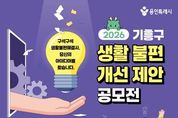(포탈뉴스통신) 용인특례시 기흥구는 오는 6일부터 5월 4일까지 ‘2026 기흥구 생활불편개선 제안 공모전’을 개최한다. 이번 공모전은 일상에서 시민이 직접 체감하는 불편사항을 발굴하고, 이를 개선할 수 있는 다양한 방안을 모색하고자 마련됐다. 주제는 일상생활에서 체감하는 생활 불편 개선 아이디어다. 시설·환경 등 각종 생활 불편 사항이나 비효율적인 행정이나 규제 등 다양한 분야의 의견을 받는다. 생활 불편에 관심 있는 누구나 참여할 수 있다. 시 누리집 ‘용인소식’의 ‘고시공고’ 또는 기흥구 누리집 ‘참여광장’의 ‘기흥소식’에서 서식을 내려받아 작성하면 된다. 작성한 제안은 방문‧우편(기흥구 관곡로 95 기흥구청 별관 2층 자치행정과 기획감사팀)으로 내면 된다. 전자우편으로도 제출할 수 있다. 부서 검토와 제안공모심사위원회 검토를 거쳐 최종 선정된 제안은 시상금(최대 100만 원)이 지급된다. 또 관련 부서 검토 등을 거쳐 행정에 반영하거나 실효성 있는 정책으로 이어질 수 있도록 추진할 방침이다. 자세한 사항은 시 또는 구 누리집에서 확인할 수 있