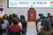 (포탈뉴스통신) 합천군은 지난 4일 군청 대회의실에서 공직자 100여 명이 참석한 가운데 2025년 11월 정례조회를 개최했다. 이번 정례조회에서는 △제12회 행복농촌만들기 콘테스트 유공 △2025년 치매극복의 날 유공 △행복동행 사회복지공무원 가족 유공 △2025년 청년 활동 유공 △2025년 양성평등주간 기념 유공 △제20회 임산부의 날 유공 등 국도정 및 군정 유공 공무원과 군민 16명에게 표창장이 수여됐다. 또한 2025년 상반기 적극행정 우수공무원으로 선정된 안전총괄과 이정일 재해복구T/F계장이‘민원中心, 현장中心’이라는 주제로 적극행정 직접 실천 사례를 발표하며 적극행정 마인드를 공유하는 시간을 가졌다. 김윤철 군수는 “작은 일이라도 군민의 입장에서 먼저 생각하고 적극적으로 실천하는 공직문화가 정착될 수 있도록 함께 노력해 달라”고 당부했으며, “다가오는 연말에는 각종 행사와 예산 마무리 등으로 업무가 많아질 시기인 만큼 소통과 협력으로 군정 목표를 차질 없이 추진해 나가자”고 강조했다. [뉴스출처 : 경상남도 합천군]