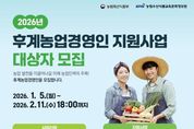 (포탈뉴스통신) 사천시가 오는 2월 11일까지 2026년 후계농업경영인 육성사업 대상자를 모집한다고 14일 밝혔다. 신청 자격은 사천시에 거주하는 만 18세 이상 50세 미만의 예비농업인으로, 독립 경영 경험이 10년 미만이거나 독립 경영 예정자이며, 병역을 필하거나 면제된 사람이다. 사업 신청은 처세대농림사업정보시스템(농업e지)을 통해 온라인으로 가능하며, 서류 평가와 평가 검증을 거쳐 2026년 4월 중 최종 결과가 발표될 예정이다. 후계농업경영인 육성사업은 선정된 농업인에게 최대 5억원의 융자 지원을 제공하고, 선정된 후계농의 영농 경영 및 역량강화를 위한 교육프로그램도 지원한다. 자세한 사항은 사천시 홈페이지에 게시된 시행 지침을 참고하거나, 사천시 미래농업과 인력육성팀으로 문의하면 된다. 박동식 시장은 "미래 농업을 이끌어 갈 후계농업경영인들이 본 지원사업을 적극 활용해 안정적으로 영농에 정착할 수 있도록 최선을 다해 지원하겠다"고 말했다. [뉴스출처 : 경상남도 사천시]