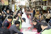 (포탈뉴스통신) 충북 단양군 단양구경시장에서 지역민과 관광객이 함께 어우러진 ‘제13회 가래떡데이 한마당 대축제’가 성황리에 열렸다. 지난 11일 단양구경시장 내 문화광장에서 열린 이번 행사는 단양구경시장상인회 주관으로 진행됐다. 올해로 13회를 맞은 가래떡데이 한마당은 지역 상권과 주민이 함께하는 소통과 나눔의 축제로 자리매김했으며, 300여 명의 주민과 관광객이 참여해 뜨거운 열기 속에 펼쳐졌다. 식전공연으로 아랑고고장구단의 힘찬 북소리가 울려 퍼지며 축제의 시작을 알렸고, 전통시장만의 흥겨운 정취 속에서 다채로운 프로그램이 이어졌다. 특히 단양시장의 명물인 ‘장보고북’ 타고 행사가 진행돼 눈길을 끌었다. ‘장보고북’은 북을 세 번 두드리면 소원이 이루어진다는 속설로 전해지며, 전통시장의 상징적인 볼거리로 자리잡고 있다. 이날의 하이라이트는 111m에 달하는 초대형 가래떡 커팅식이었다. 지역 주민과 관광객이 힘을 모아 가래떡을 뽑고 직접 나누며 웃음이 넘쳤고, 정성껏 준비한 따뜻한 떡을 함께 나누는 시간에는 박수와 환호가 이어졌다. 또한 개그맨