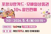 (포탈뉴스통신) 포항시가 침체된 민생경제에 활력을 불어넣기 위해 내달 4일부터 카드형·모바일 포항사랑상품권(포항사랑카드) 160억 원을 10% 할인된 금액으로 판매한다. 시는 올해 들어 이달까지 총 1,230억 원 규모의 포항사랑상품권을 발행한 데 이어, 이번 할인 판매분 160억 원을 유통해 지역 상권 내 소비를 촉진하고 경기 회복 흐름을 이어간다는 방침이다. 특히 시는 고유가·고물가로 인한 시민들의 생활 안정을 위해 지급하는 고유가 피해지원금의 지급수단에 포항사랑카드를 포함해 사용 편의를 높였으며, 이번 할인 판매를 병행해 지역 내 소비 활성화를 유도하고 자금의 역외 유출을 방지할 계획이다. 이번에 할인 판매하는 포항사랑상품권이 위축된 지역 소비를 촉진해 소상공인의 매출 회복에 도움이 되고 자금의 지역 내 순환 구조를 강화해 지역경제 회복을 견인하는 마중물 역할을 할 것으로 기대된다. 가정의 달을 맞아 제공되는 포항사랑카드 10% 할인 혜택으로 시민들의 가계 부담 완화에도 도움이 될 것으로 보고 있다. 개인 구매 한도는 월 40만 원, 보유 한도는 70만 원이다.