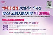 (포탈뉴스통신) 부산시는 오늘(16일)부터 12월 31일까지 77일간, 고향사랑기부제 참여 확산을 위해 '역대급 경품 대발사 시즌2! 부산 고향사랑기부제 연말 빅 이벤트'를 개최한다고 밝혔다. 지난 5월 진행된 ‘역대급 경품 대발사’ 이벤트는 해운대 5성급 호텔 숙박권을 포함한 푸짐한 경품으로 많은 시민들의 뜨거운 관심과 참여 속에 성황리에 마무리됐다. 이번 시즌2 이벤트는 그 성원에 힘입어 더욱 풍성한 혜택과 경품으로 시민들을 다시 한번 찾아온다. 특히, 올해 10월 17일부터 부산에서 개최되는 제106회 전국체육대회와 연계해 이번 이벤트를 가을부터 연말까지 이어가며, 시민들에게 다채로운 혜택과 즐거움을 제공할 계획이다. 이와 함께 시는 전국체전 기간(10.17.~10.23.)과 전국장애인체전 기간(10.31.~11.5.)에 ‘고향사랑기부제 홍보 공간(부스)’을 운영해 현장 방문객들에게 기부제 취지와 참여 방법을 적극 알릴 예정이다. 또한 이벤트 기간 중 시청에 1회 10만 원 이상 기부한 기부자에게 기본혜택 2가지와 함께 특별한 추가 경품 4가지를 증정한다. [기본혜택(