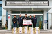 (포탈뉴스통신) 영주시는 지난 16일 ㈜예천친환경급식센터(대표 신규용)가 영주시청을 방문해 소면 300kg(81만 원 상당)을 기탁했다고 밝혔다. 이날 기탁식에는 ㈜예천친환경급식센터 신규용 대표와 유정근 영주시장 권한대행이 참석해 나눔의 의미를 함께 나누며 감사의 뜻을 전했다. 특히 이번 기부는 ‘희망2026 나눔캠페인’에 현물 기부로 참여한 것으로, 연말을 맞아 지역사회에 따뜻한 온기를 전하는 데 의미를 더했다. 이번에 기탁된 소면은 관내 경로식당과 장애인복지시설 등 지역 내 취약계층 이용 시설 16개소에 전달될 예정이다. 신규용 대표는 “연말을 맞아 지역 어르신들과 복지시설 이용자분들께 조금이나마 도움이 되고자 기탁을 결정했다”며, “앞으로도 지역과 함께 성장하는 기업으로서 지속적인 나눔 활동에 동참하겠다”고 말했다. 유정근 영주시장 권한대행은 “어려운 이웃을 위해 따뜻한 손길을 보내주신 ㈜예천친환경급식센터 신규용 대표께 깊이 감사드린다”며, “희망2026 나눔캠페인 참여를 통해 지역사회 전반에 따뜻한 연말 분위기 확산에 큰 힘이 되고 있다”고 밝혔다. 영주시는 앞으로도