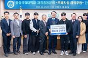 (포탈뉴스통신) 경상국립대학교 재경총동문회 임원 5명이 12월 17일 오후에 모교를 찾아왔다. 재경총동문회 김원 회장, 김동재 수석부회장, 김재경 등산회장, 서성옥 의전국장, 배동렬 사무국장이다. 이들은 경상국립대학교 권진회 총장, 오재신 국제처장, 하재필 학생처장, 염준호 학생부처장 등 대학본부 주요 관계자와 총학생회 박한세 회장, 안태용 부회장, 총대의원회 김용관 의장, 총동아리연합회 여준모 회장과 마주앉았다. 김원 회장은 “지난해부터 재경총동문회 차원에서 적극적으로 후원하는 ‘천원의 아침밥’ 사업이 올해 잘 진행됐는지, 내년에는 어떻게 할 것인지, 동문회에서 무엇을 어떻게 도우면 되는지” 물었다. 경상국립대학교 재경총동문회 간부들은 매월 순번을 정해 놓고 50만 원씩 모교의 ‘천원의 아침밥’ 사업을 후원하고 있다. 이렇게 이어지는 기부금의 총 누적액은 1285만 원이다. 재경총동문회의 후배사랑 급식후원은 생각보다 훨씬 규모가 크다. 물론 총동문회도 함께한다. ▲재경총동문회 1285만 원 ▲총동문회 500만 원 ▲한국농어촌공사 재직 동문회 275