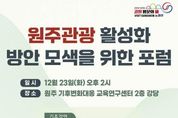 (포탈뉴스통신) 원주시는 오는 23일 오후 2시, 기후변화대응교육연구센터 2층 대강당에서 ‘원주관광 활성화 방안 모색을 위한 포럼’을 개최한다. 이번 포럼은 원주시와 강원일보가 공동으로 주최하고, 한국관광공사와 (재)강원관광재단이 후원한다. 원주 관광산업의 현주소를 진단하고 타 지역의 우수사례를 공유해, 원주관광의 발전 방향을 제시하는 자리이자, 원주 관광산업 활성화를 위한 다양한 방안과 대안을 모색하는 장이 될 전망이다. 포럼은 상상콘텐츠연구소 이종원 소장의 ‘여행작가가 바라본 강원특별자치도 원주시’ 기조강연으로 시작된다. 이어 한국관광공사 이재훈 국민관광전략팀장이 로컬관광 활성화 전략 우수사례를 공유하고, 한라대학교 배준호 교수가 원주 지역 웰니스 관광 활성화 전략을 발표했다. 또한 김혁성 원주시의원이 관광콘텐츠 개발 연구회 성과를 소개한다. 마지막으로 강원일보 권혁순 논설주간이 좌장을 맡아 상지대학교 장병주 경상대학장, 강원관광재단 원문규 관광마케팅실장, 정영직 원주시관광협의회장이 토론을 진행하며 질의응답 시간을 갖는다. 원강수 원주시장은 “이번 포럼에서 제시되는 창의적이고 심도 있는 제안들이