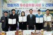 (포탈뉴스통신) 고창군이 지난 17일 2025년 하반기 민원·국민신문고 응대 우수공무원을 선정해 시상식과 간담회를 열었다. 민원처리 우수공무원은 각 분야별로 5명씩을 선정하여 표창을 수여했다. 먼저, 국민신문고 분야는 민원처리 건수, 담당자의 민원요지 파악, 성실한 답변 등을 평가했다. 서민지 주무관(도시디자인과), 김민경 주무관(환경위생과), 고민성 주무관(사회복지과), 박재규 주무관(종합민원과), 유혜령 주무관(문화예술과)이 선발됐다. ‘민원처리 마일리지 분야’는 처리기간이 2일 이상인 법정 민원에 대해서 단축 일수를 마일리지로 적립해 누적 점수가 높은 공무원을 선정했다. 남혜원 주무관(사회복지과), 이민해 주무관(환경위생과), 송서경 주무관(신활력경제정책관), 전필규 주무관(사회복지과), 배재영 주무관(해양수산과)이 선정됐다. 고창군수는 시상식 이후 민원 처리 우수공무원들의 애로사항과 건의 사항을 청취했다. 고창군수는 “국민신문고 민원 처리와 민원 실적은 단순한 처리 건수를 넘어 국민의 불편 해소와 ‘신뢰받는 행정 구현’에 중요한 지표다”며, “앞으로도 친
