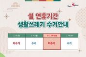 (포탈뉴스통신) 성주군은 설 명절을 맞아 귀성객과 주민들이 쾌적한 환경 속에서 명절을 보낼 수 있도록 2월 2일부터 2월 20일까지 '설 연휴 쓰레기 종합관리대책'을 추진한다. 군은 연휴 기간 귀성객과 군민의 생활 불편을 최소화하기 위해 연휴를 전·중·후로 구분한 대응체계를 마련한다. 연휴 전에는 주요거리 등의 쓰레기 중점 수거와 환경정비를 실시하고 음식물쓰레기 증가에 대비한 비상 수거용기를 비치한다. 연휴 중에는 특별상황반을 운영해 생활폐기물 처리와 민원에 대응하며, 읍·면의 상황반과 비상연락체계를 유지한다. 연휴 이후에는 마무리 대청소와 노면청소차 운영을 통해 깨끗한 환경 조성에 힘쓸 계획이다. 특히 명절 선물 포장 등으로 스티로폼 상자와 종이박스 배출이 증가할 것으로 예상됨에 따라, 관내 유통업소에서 판매되는 설 선물류의 과대포장 및 재포장 행위에 대해서도 점검을 실시한다. 또한 주민들에게 배출장소 내 무분별한 투기를 예방하기 위한 지도·단속과 함께 재활용품 올바른 분리배출 방법에 대한 홍보를 강화할 예정이다. 자원순환사업소 관계자는 “설 명절 기간 생활폐기물 발생량이 급증할 것으로 예상된다”며 “원활한