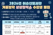 (포탈뉴스통신) 여수시는 12월 29일부터 2026년 1월 7일까지 ‘2026년 이순신도서관 겨울방학 상상창작소’ 수강생을 선착순 모집한다. 이번 프로그램은 관내 초등학생을 대상으로 하는 7개 강좌로 구성되며, 2026년 1월 12일부터 2월 5일까지 운영된다. 개설 강좌는 ▲어린이 로봇 체험(비누로봇) ▲인공지능코딩(알버트로봇) ▲코딩로봇 만들기(프로보익사이팅) ▲메이커교육(스마트시티 만들기) ▲메타버스와 로블록스 ▲VR체험 ▲드론체험 등 7개 강좌다. 강좌별 10명 내외 수강생을 선착순으로 모집하며, 참가 희망자는 여수시립도서관 누리집에서 본인 또는 보호자가 신청하면 된다. 기타 자세한 사항은 이순신도서관으로 문의하면 된다. 시 관계자는 “겨울방학을 맞아 초등학생들이 도서관을 통해 다양한 인공지능 콘텐츠를 접할 수 있도록 프로그램을 마련했다”며 “어린이들의 많은 신청을 바란다”고 말했다. [뉴스출처 : 전라남도 여수시]