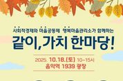 (포탈뉴스통신) 가평군은 오는 18일 오전 10시부터 오후 3시까지 음악역 1939 광장에서 주민과 함께하는 축제 ‘2025년 같이, 가치 한마당’을 연다. 이번 행사는 사회적경제기업의 판로 확대와 마을공동체, 경기행복마을관리소의 활동 성과를 알리고 주민 참여를 확대하기 위해 마련됐다. 행사에는 사회적경제기업 5곳, 마을공동체 16곳, 경기행복마을관리소 4곳 등 총 25개 단체가 참여한다. 이날 주민들은 현장에서 직접 사회적경제기업의 제품을 구매할 수 있으며, 공동체별 특색 있는 프로그램을 즐길 수 있다. 주요 프로그램은 △사회적경제기업 생산품 홍보·판매 △공동체와 경기행복마을관리소 활동 전시 및 무료 체험 △합창·뮤지컬 갈라쇼·힐링체조 등 공연 △경품 이벤트 등이 마련돼 있다. 특히 가평마을교육공동체가 제작한 단편영화 상영 등 주민 주도 콘텐츠도 선보일 예정이다. 가평군 관계자는 “‘같이, 가치 한마당’ 축제를 통해 지역사회에서 사회적경제와 공동체 활동이 더욱 확산되기를 기대한다”며 “이번 행사가 지역경제의 활력으로 이어질 수 있도록 주민 여러분의 많은 방문과 성원을 부탁드린다”고 말했다 [뉴