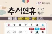 (포탈뉴스통신) 금천구는 추석 연휴 기간 생활쓰레기(일반생활쓰레기, 음식물쓰레기, 재활용품) 수거를 일시 중단한다고 밝혔다. 환경미화원들의 휴식권을 보장하고 안전한 근무 환경을 조성하기 위한 조치라고 구는 설명했다. 수도권매립지관리공사와 청소대행업체도 휴무다. 이에 따라 주민들은 10월 3일과 7일, 9~10일 오후 6시부터 자정까지 대형생활폐기물을 제외한 모든 생활쓰레기를 배출할 수 있다. 연휴 기간 중 생활쓰레기 배출이 금지되는 날은 2일과 4~6일, 8일, 11일이다. 구는 쓰레기배출이 일시 중단됨에 따라 주민 불편을 최소화하기 위한 청소상황실과 청소대행업체 기동반을 편성·운영한다. 쓰레기 관련 민원에 신속히 대응할 방침이다. 또한 연휴가 끝나는 10일부터는 인력과 장비를 총동원해 적체된 쓰레기를 일제 수거할 계획이다. 유성훈 금천구청장은 "평소에 묵묵히 금천의 청결을 책임지고 있는 환경미화원 분들께 감사드린다“라며 ”추석 연휴 기간 쓰레기 배출일을 꼭 확인하시어, 서로 배려하고 즐거운 명절을 보낼 수 있도록 주민 여러분의 많은 이해와 적극적인 참여를 부탁드린다”라고 말했다.