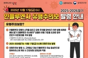 (포탈뉴스통신) 남원시는 질병관리청이 지난 17일 0시부로 전국에 ‘2025-2026절기 인플루엔자 유행주의보’가 발령함에 따라 인플루엔자 예방접종 및 호흡기 감염병 예방수칙 준수를 당부했다. 질병관리청에서 운영 중인 의원급 의료기관 인플루엔자 의사환자 표본감시 결과, 올해 40주차(9.28.~10.4.) 인플루엔자 의사환자 분율이 1,000명당 12.1명으로, 25~26절기 인플루엔자 유행기준인 9.1명을 초과하여 작년보다 약 두 달 가량 빠른 17일에 인플루엔자 유행주의보를 발령했다. 인플루엔자 유행주의보 발령되면, 고위험군 대상 인플루엔자 의심 증상만으로 항바이러스제(2종) 처방시 건강보험 요양급여 적용된다. 고위험군은 소아, 임신부, 65세 이상, 면역저하자, 대사장애, 심장질환, 폐질환, 간질환, 혈액질환, 신경계질환 및 신경발달 장애 등이 해당되며, 항바이러스제는 오셀타미비르 경구제(타미플루캡슐 등)와 자나미르 외용제(리렌자로타디스크)가 해당된다. 이에, 남원시는 65세 이상 어르신과 어린이 등 인플루엔자 고위험군은 인플루엔자의 본격적이 유행에 앞서 예방접종을 받으시고, 고열 등 인플루엔자 증상이 있는 경우는 신속하게 진료를 받아야 하고, 호흡기