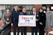(포탈뉴스통신) 사내 헌혈 캠페인 및 자발적 기증을 통해 모은 헌혈증서 107장 경남혈액원에 전달 (재)김해문화관광재단(대표 최석철)은 지난 2월 11일, 지역사회의 혈액 수급 안정과 생명 나눔 문화 확산을 위해 임직원들이 자발적으로 모은 헌혈증서 107장을 대한적십자사 경남혈액원에 전달했다고 밝혔다. 재단은 지난 1월 26일 진행된 「사랑의 헌혈」 행사와 그간 진행해 온 상시 기부 캠페인을 통해 총 107장의 헌혈증서를 모았다. 이는 당초 목표했던 100장을 초과 달성한 수치로, 사내 헌혈 행사를 통해 모인 증서와 임직원들이 개인적으로 소지하고 있던 증서를 자발적으로 전달하며 총 107장이라는 뜻깊은 숫자를 기록했다. 전달식은 김해문화의전당에서, 김해문화관광재단 최석철 대표이사와 대한적십자사 경남혈액원 이정우 원장 등이 참석한 가운데 진행됐다. 기부된 헌혈증서는 향후 지역 내 수혈이 필요한 환우 및 긴급 혈액 수급 상황 등에 소중하게 사용될 예정이다. 김해문화관광재단 김봉조 경영기획본부장은 “임직원들의 적극적인 참여 덕분에 100장이 넘는 소중한 마음을 모을 수 있었다”고 밝혔다. &