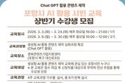 (포탈뉴스통신) 포항시는 지난해 시민들로부터 큰 호응을 얻었던 ‘생성형 AI 활용 콘텐츠 제작 특강’을 올해도 정규 편성하고, 오는 23일부터 2026년도 상반기(1·2기) 수강생을 모집한다. 이번 특강은 ChatGPT를 활용한 생성형 AI를 실생활과 업무에 즉각적으로 활용할 수 있는 실질적인 학습 기회를 제공하기 위해 마련됐다. 지난해 실시된 특강이 시민들로부터 높은 관심과 만족도를 기록함에 따라, 시는 총 6기에 걸쳐 확대 운영할 계획이다. 이번 모집은 그중 상반기에 시작되는 1기와 2기를 대상으로 진행된다. 교육은 기수별로 4주 동안 주 1회(회당 2시간)씩 진행된다. 야간반인 1기는 3월 3일부터 24일까지 매주 화요일 오후 7시에 운영되며, 2기는 3월 9일부터 30일까지 매주 월요일 오전 10시에 시작된다. 교육 장소는 경북콘텐츠기업지원센터 5층이다. 포항시민이라면 누구나 신청 가능하며, 모집 인원은 기수별 20명씩 총 40명이다. 단, 더 많은 시민에게 교육 기회를 제공하기 위해 중복 접수는 불가능하다. 접수 기간은 오는 23일부터