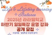 (포탈뉴스통신) 원주시 평생교육원 학습관은 9월 22일부터 28일까지 2025년 라라밸학교 하반기 일일특강 운영 강좌(강사)를 모집한다. 라라밸학교(Life · Lifelong-learning Balance)는 시민들의 삶과 평생학습의 조화를 위해 다양한 일일특강 등 단기프로그램을 개설·운영하는 사업이다. 요리·공예·미술·운동 등 일일특강이 가능한 분야를 대상으로 강좌를 공개모집하고 있다. 강좌 신청은 9월 22일부터 28일까지 전자우편으로 접수한다. 제출 서류 등 세부 내용은 학습관 홈페이지에 게시된 공고문에서 확인할 수 있다. 이번 모집에 선정된 10개 강좌는 11월 1일 학습관에서 일일특강으로 진행될 예정이다. 윤석재 학습관장은 “시민들이 다양한 평생학습 프로그램을 접하고 배움의 기쁨을 느끼는 행복한 일상을 보낼 수 있도록 더욱 힘쓰겠다”라고 말했다. [뉴스출처 : 강원도 원주시]