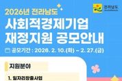 (포탈뉴스통신) 전라남도는 오는 27일까지 사회적경제기업의 지속적이고 안정적인 성장과 자립을 지원하기 위한 2026년 사회적경제기업 재정지원사업 공모를 추진한다. 이번 공모는 ▲일자리창출 지원 ▲사업개발비 지원 ▲시설장비 지원 ▲시군 지역 특화사업 지원, 4개 분야로 나눠 530여 기업에 총 49억 원을 지원할 예정이다. 지난해(27억 원)보다 대폭 확대된 규모다. 특히 올해는 기업 선호도가 높은 인건비에 국비 지원이 재개되고, 도 자체 지원도 확대해 기업의 고용 부담을 완화하고 안정적 일자리 창출을 적극 지원할 방침이다. 일자리창출사업은 진입 초기 사회적기업을 대상으로 취약계층 고용 1명당 월 50만~90만 원을 최대 3년간 인건비로 지원하며, 도 자체 지원사업인 전남형 일자리창출사업은 일반인력과 전문인력까지 추가로 지원한다. 사업개발비 사업은 사회적경제기업의 제품 품질개선, 디자인과 시제품 제작, 홍보비 등 최대 1억 원을 지원한다. 시설장비 사업은 기업이 신규 시설장비를 구입하거나 노후 시설장비 교체 시 최대 2천만 원을 지원한다. 이외에도 시군 실정에 맞