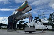 (포탈뉴스통신) 영동세계국악엑스포조직위는 영동세계국악엑스포 개막과 함께 행사장 내에 설치된 상징조형물인 ‘전통의 울림, 미래를 울리다’의 제막식을 26일 개최했다고 밝혔다. 이날 제막식에는 국악엑스포 공동위원장인 정영철 영동군수, 윤영달 크라운해태 회장을 비롯해 민의식 국악 엑스포 집행위원장, 신현광 영동군의회 의장 등 주요 내빈이 참석해 자리를 빛냈다. 국악엑스포 상징조형물은 복합문화예술회관 옆에 높이 6미터, 세로 8.7미터, 가로 6.7미터 규모로, 금속 조각가 심병건 작가가 제작했다. ‘ㄱ’자 기울기에서 가장 맑은 소리를 내는 115도로 깎는 편경을 모티브로 하여 제작된 기하학적 구조의 세 개의 기둥은 국악이 지닌 맑고 청아한 울림을 형상화한다. 또, 음의 파동과 리듬으로 시각화된 율관과 한국 고유의 정체성을 의미하는 오방색 띠로 열린 세계를 향해 뻗어 나가는 에너지를 나타낸다. 세 개의 기둥과 함께, 중앙의 상단에 편종과 편경을 의미하는 파이프를 조형하여 ‘울림과 진동’이 이곳에서 시작돼 세상에 울려 퍼져나감을 표현했다. 16개의 편종은 관람객들이 각각을 두드려 직접 울림과 진동을 느끼며
