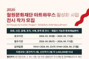 (포탈뉴스통신) (재)철원문화재단은 2026년 아트하우스 전시에 참여할 작가를 오는 4월 8일부터 17일까지 공개 모집한다. 이번 공모는 단순히 작품을 전시하는 형식을 넘어, 전시 공간에서의 관람 경험, 체험 프로그램, 도슨트 운영까지 작가와 함께 만들어가는 전시로 운영될 예정이다. 아트하우스는 지역 주민과 방문객이 일상 속에서 자연스럽게 예술을 경험할 수 있도록 조성된 문화예술 공간으로, 2026년에는 공모전시 4회와 기획전시 2회를 운영할 예정이며, 지난해에는 공모전시 3회와 대관전시 3회를 진행하는 등 다양한 전시와 체험 프로그램을 통해 생활 밀착형 예술 향유 기회를 꾸준히 제공해왔다. 이번 공모를 통해 선정된 작가는 전시 기간 동안 작품 설치 및 철수, 공간 구성, 관람 동선 기획, 관람객 대상 체험 프로그램(해당 시), 도슨트 운영 협력, 홍보 협조 등 전시 전반의 운영 과정에 참여하게 된다. 철원문화재단 박현웅 본부장은 “이번 공모는 전시 결과물뿐 아니라 전시가 운영되는 전 과정을 작가와 함께 만들어가는 협력 프로젝트로, 작가의 창작활동을 적극 지원하는 데 중점을 두고 있다”며, “관람