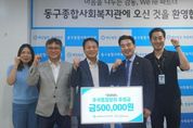 (포탈뉴스통신) 부산 동구, 동구종합사회복지관은 근로복지공단 부산지역본부에서 10월 1일 추석 명절을 앞두고, 동구 지역 소외계층에게 힘이 될 수 있도록 50만 원의 후원금을 동구종합사회복지관에 전달했다고 밝혔다. 해당 성금은 동구 지역 내 취약계층의 추석 명절맞이 지원으로 활용될 예정이다. 이외에도 근로복지공단 부산지역본부에서는 임직원들이 매주 수요일마다 복지관 4층 장난감도서관을 방문해 어린아이들이 안전하게 놀 수 있도록 장난감 소독 봉사활동에 꾸준히 참여하고 있다. 민병창 근로복지공단 부산지역본부장은 “어른, 아이 할 것 없이 모두가 행복하고 즐거운 동구가 될 수 있도록 앞으로도 다양한 활동을 통해 사회공헌사업을 이어나가겠다” 고 밝혔다. [뉴스출처 : 부산시동구]