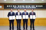 (포탈뉴스통신) 충주시는 31일 시청 중회의실에서 2027년 하계세계대학경기대회의 성공적인 개최와 문화예술 발전을 위해 국립한국교통대학교, 건국대학교 글로컬캠퍼스, 충주시체육회와 공식 업무협약을 체결했다. 이번 협약은 지역 주요 체육관과 충주문화회관의 리모델링 공사로 경기장과 문화시설 활용이 일시적으로 제한됨에 따라, 지역 대학교 시설을 비롯한 각종 지원 협력을 공식화하기 위해 마련됐다. 협약식에는 조길형 충주시장, 윤승조 국립한국교통대학교 총장, 최영근 건국대학교 글로컬캠퍼스 부총장, 진용섭 충주시체육회장 등이 참석해 전문체육 및 생활체육 활성화, 문화예술 발전 등을 위한 협력 강화, 협약 기관 간 인적 인프라 지원 등 다양한 분야에서 협력하기로 뜻을 모았다. 협약을 통해 각 기관의 체육관 등 시설 대관 시 적극적인 협조를 받고, 주요 행사 진행 시 기관 간 자원봉사 등 인프라 지원이 이뤄질 것으로 기대된다. 조길형 시장은 “2027년 U대회 성공 개최와 문화예술 발전을 위해 모두가 한 데 힘을 모으는 좋은 계기가 마련됐다”라며, “이번 U대회는 대학생들과 지역사회 모두가 어우러져 함께 만드는 국