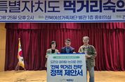 (포탈뉴스통신) 남관우 전주시의회 의장이 24일 전주를 방문한 윤호중 행정안전부 장관에게 완주·전주 통합 주민투표 추진 촉구 결의안을 전달했다. 전주시의회는 앞서 22일 열린 제424회 임시회 1차 본회의에서 해당 결의안을 만장일치로 채택하고, 행정안전부장관 등에게 전달키로 한 바 있다. 남 의장은 대한민국사회적경제박람회 참석을 위해 이날 전주를 방문한 윤 장관에게 결의안을 전달하며 “완주‧전주 통합은 행정 효율성 제고를 넘어, 전북의 성장 거점을 완성하기 위한 시대적 과제”라며 “정부가 양 지역의 통합을 위해 주민투표를 할 수 있도록 적극적 지원과 협력에 나서달라”고 요청했다. 남 의장은 특히 “완주와 전주는 생활권, 경제권, 문화권을 이미 공유하고 있는 하나의 공동체”라며 “지속가능한 지역발전과 국가균형발전의 실현을 위해 통합 논의가 더 이상 늦춰져서는 안 된다”고 강조했다. 이날 전달한 결의안은 남 의장이 지난 임시회에서 직접 발의한 것으로 ▲행정안전부의 즉각적인 주민투표 권고 ▲정부의 갈등 해소를 위한 실질적‧구체적 방안 마련 ▲지방시대위원회와 중앙정부의 적극적인 지원책 수립 등의 내용을 포함하고 있